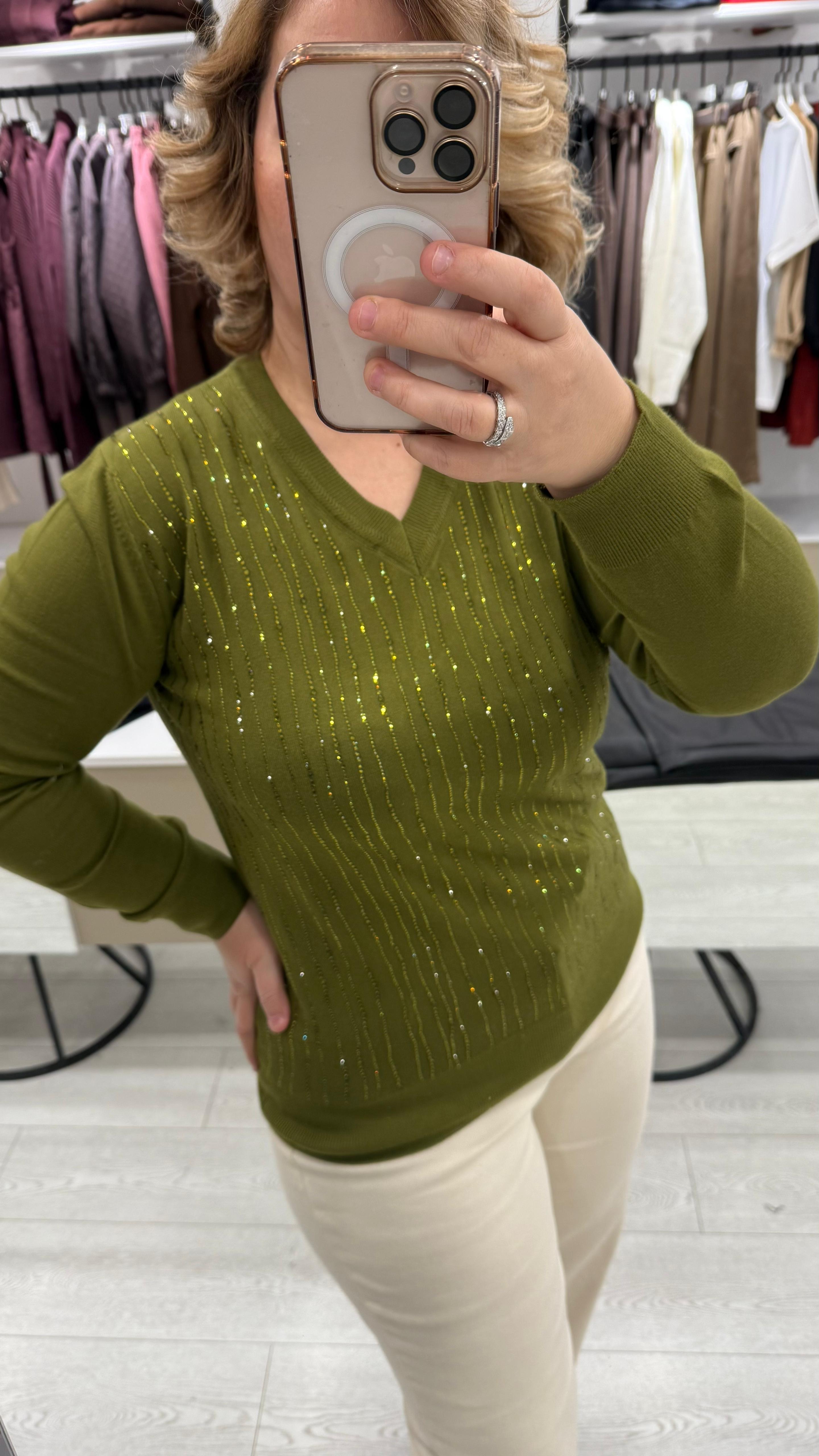 V Yaka Taş Detaylı Triko